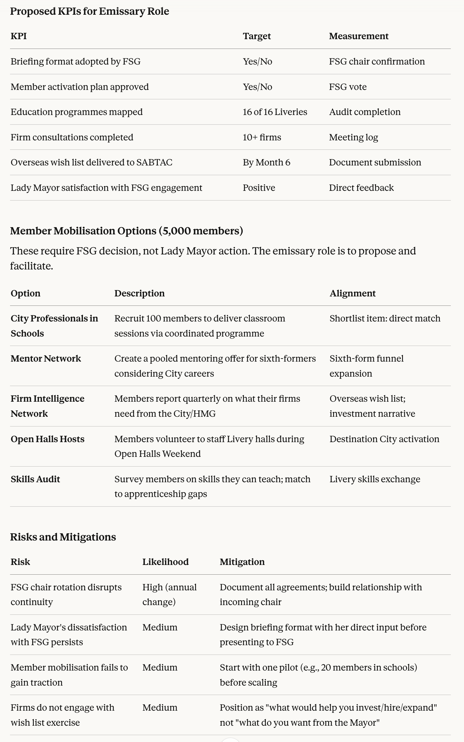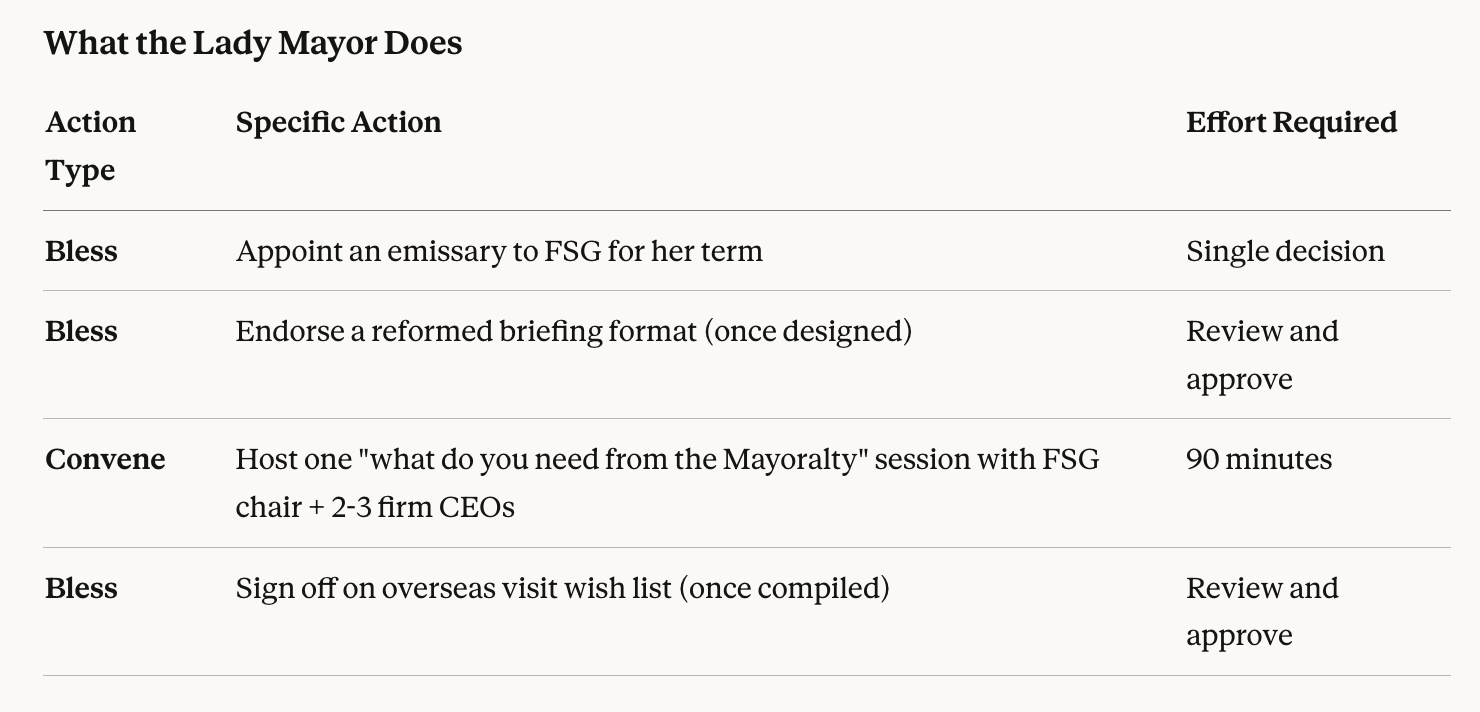 This structure separates what the Lady Mayor must do (minimal, high-leverage) from what the emissary and FSG must deliver (substantial, operational). The "blessing" model is preserved.